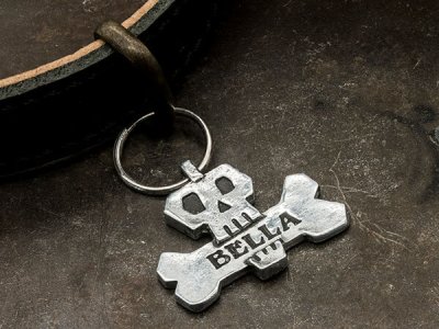 Placa personalizable con CALAVERA para mascotas en laton dorado