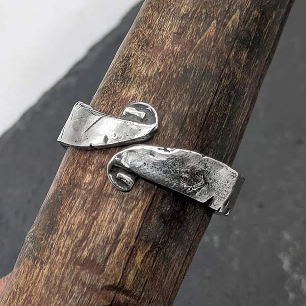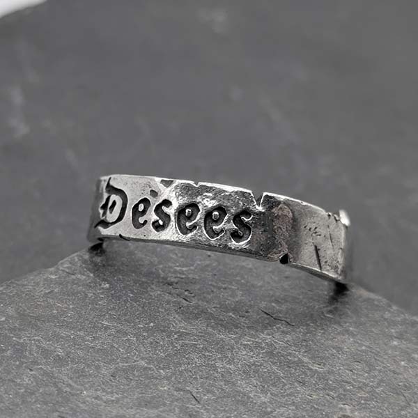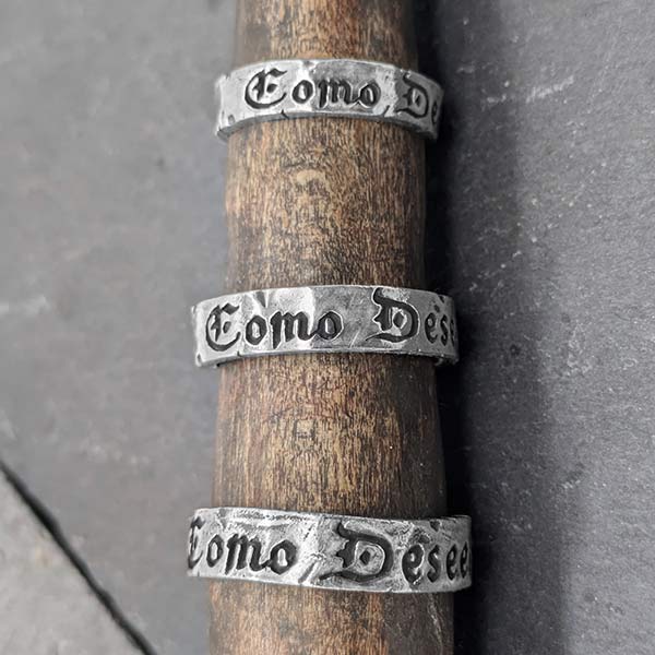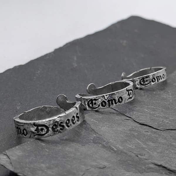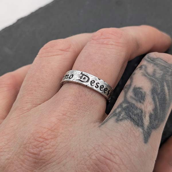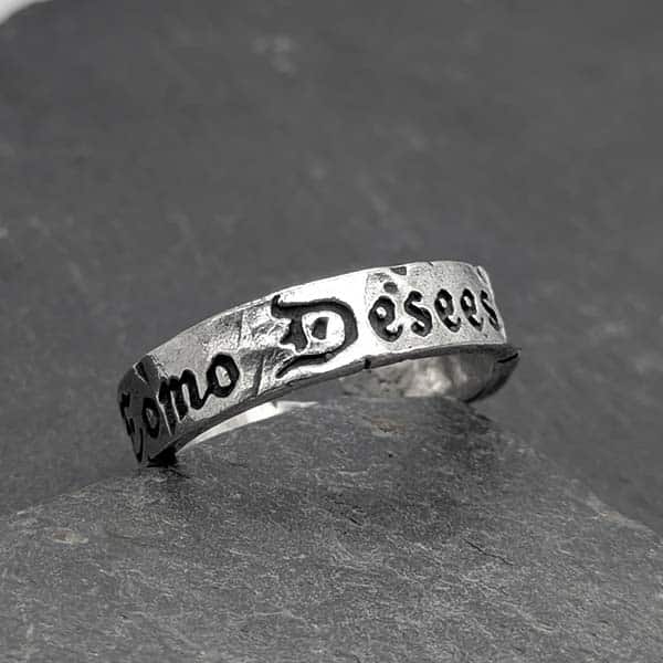 In addition, the ring’s design evokes an ancient papyrus scroll. It feels as if the phrase were written on a document from an epic tale. Therefore, the piece looks like an oath meant to last forever.