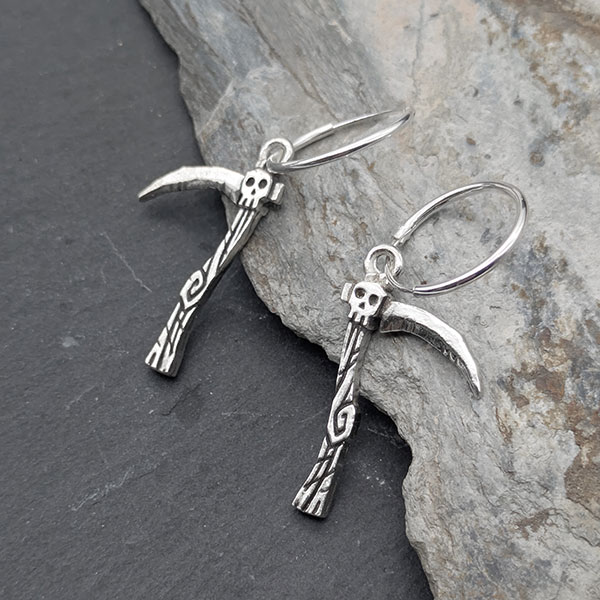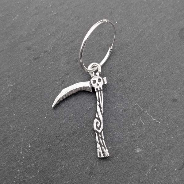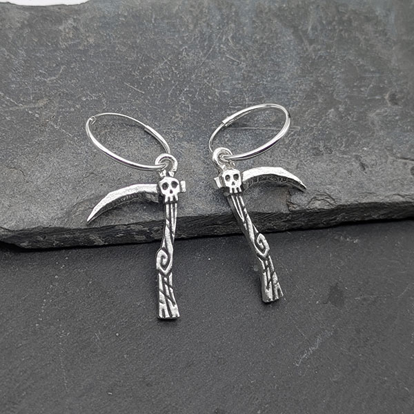 This silver scythe earrings Hand-forged from 925 sterling silver, each pair features more details than an ancient spell: wood-grain textures on the handle, a slightly nicked blade that shows some “hard work” experience, and a cheeky little skull that seems to say, “relax, I’m just here to cut the boredom.”