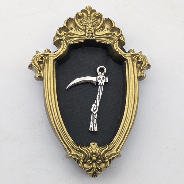 Scythe: 2.8 cm (1.1 in) high (including the ring) x approximately 1.5 cm (0.5 in) wide.